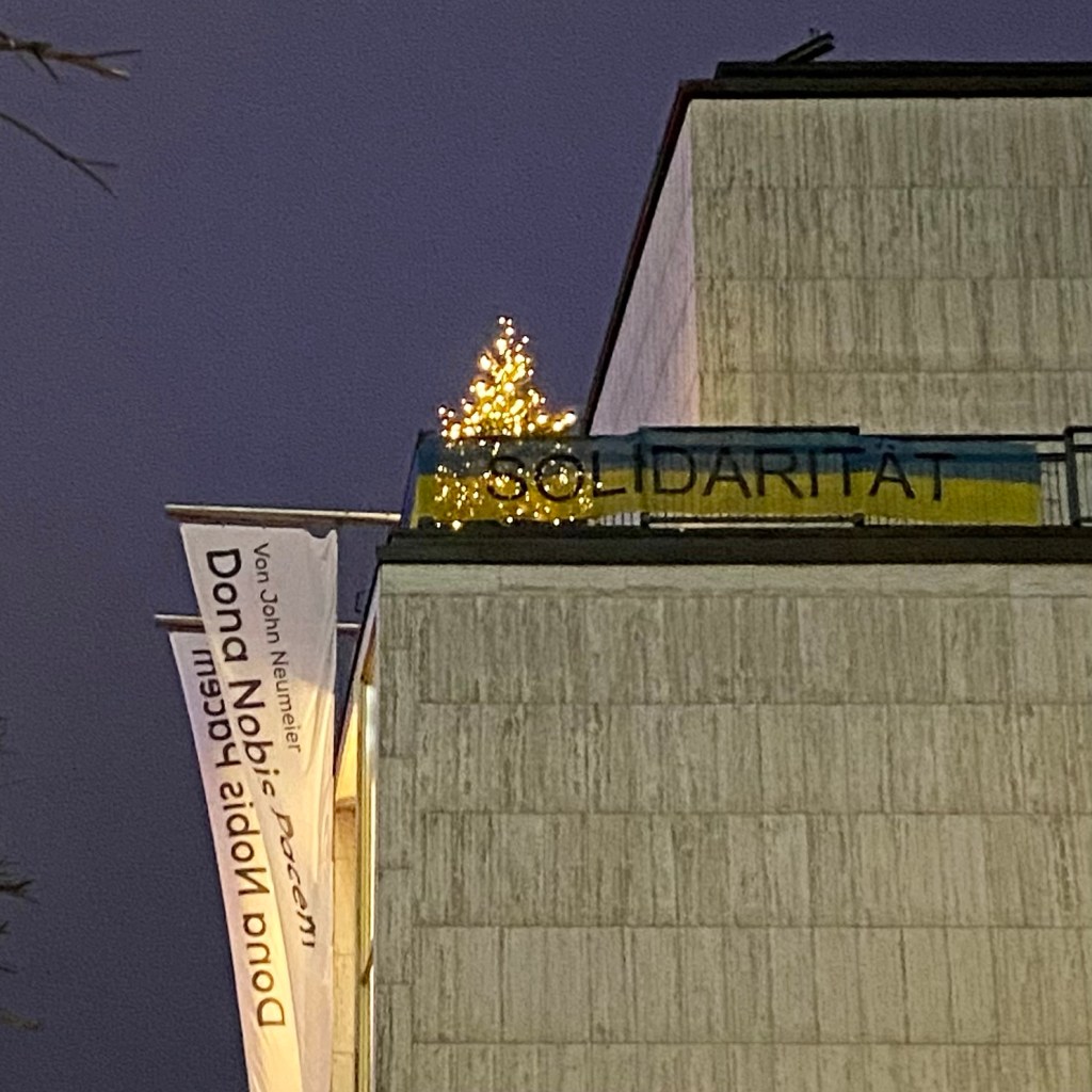 [GJ:] „Ach, wie schön: Da hängen die ‚Dona Nobis Pacem‘-Fahnen!“