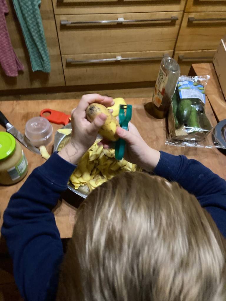 [KJ:] „Ich schäle auch Kartoffeln! Ich bin ein guter Schäler!Warum tust Du da Zwiebeln rein?“