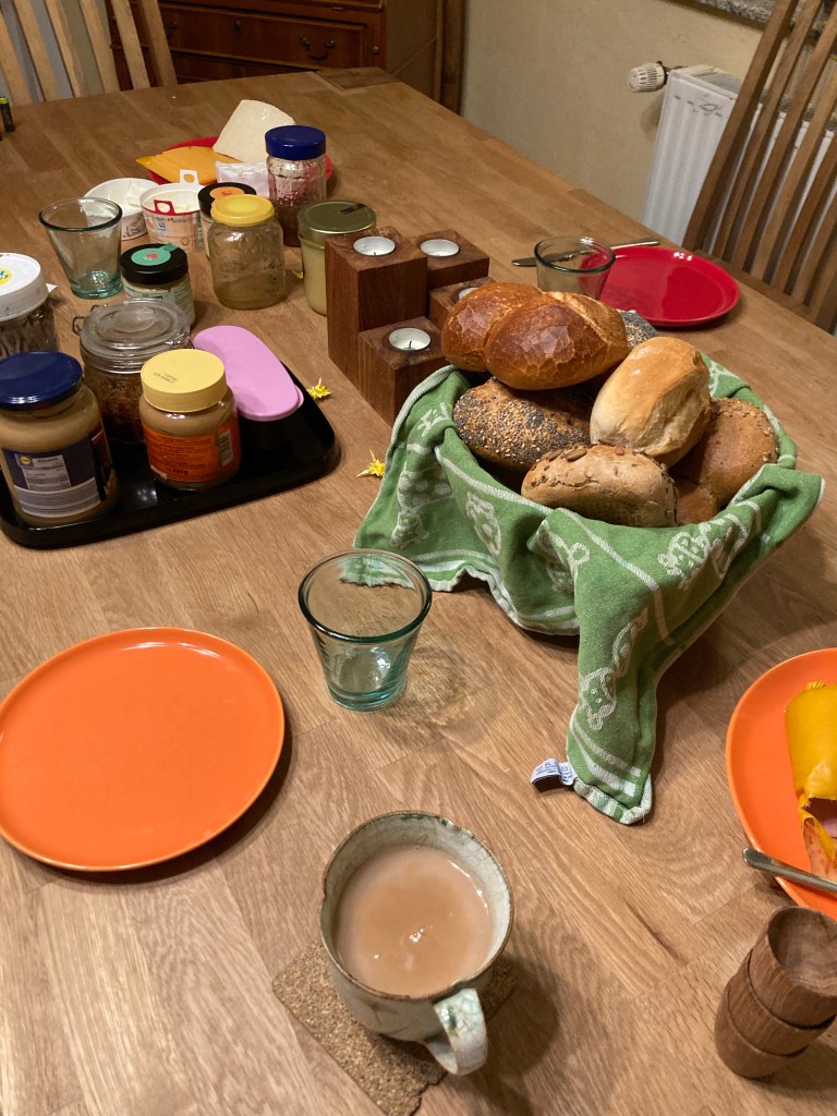 [Etwas später. folienstern:] „Der Weihnachtsstern ist vollständig, Frühstückstisch gedeckt – dann kann’s ja fast losgehen.“