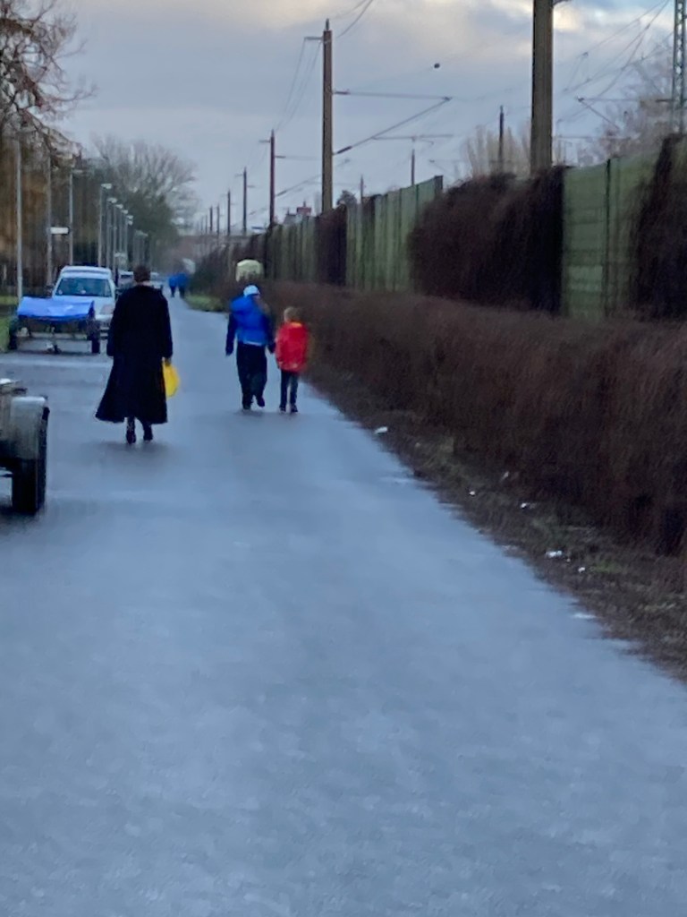 [kneteeis:] „Komm‘, wir gehen jetzt los zum Schlachter. Vielleicht haben wir Glück und die Schlange ist gerade nicht so lang, weil die Leute weg sind, die um acht Uhr da waren…“