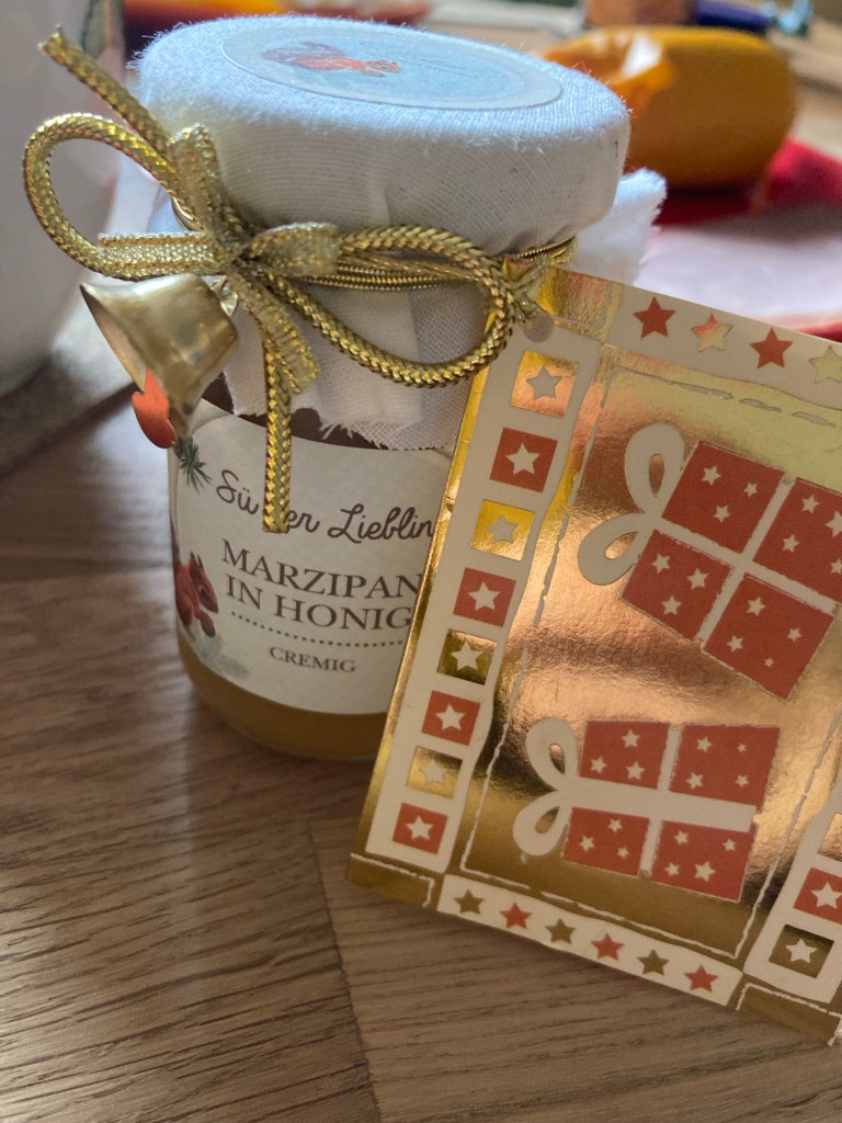 [Etwas später:] „Mal sehen, wie das Marzipan in Honig schmeckt, das ich gestern bekommen habe!“