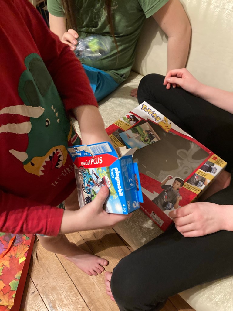 [Alle Kinder:] „Jetzt ist Bescherung! Machen wir wieder abwechselnd die Geschenke auf? Und alle gucken zu?“