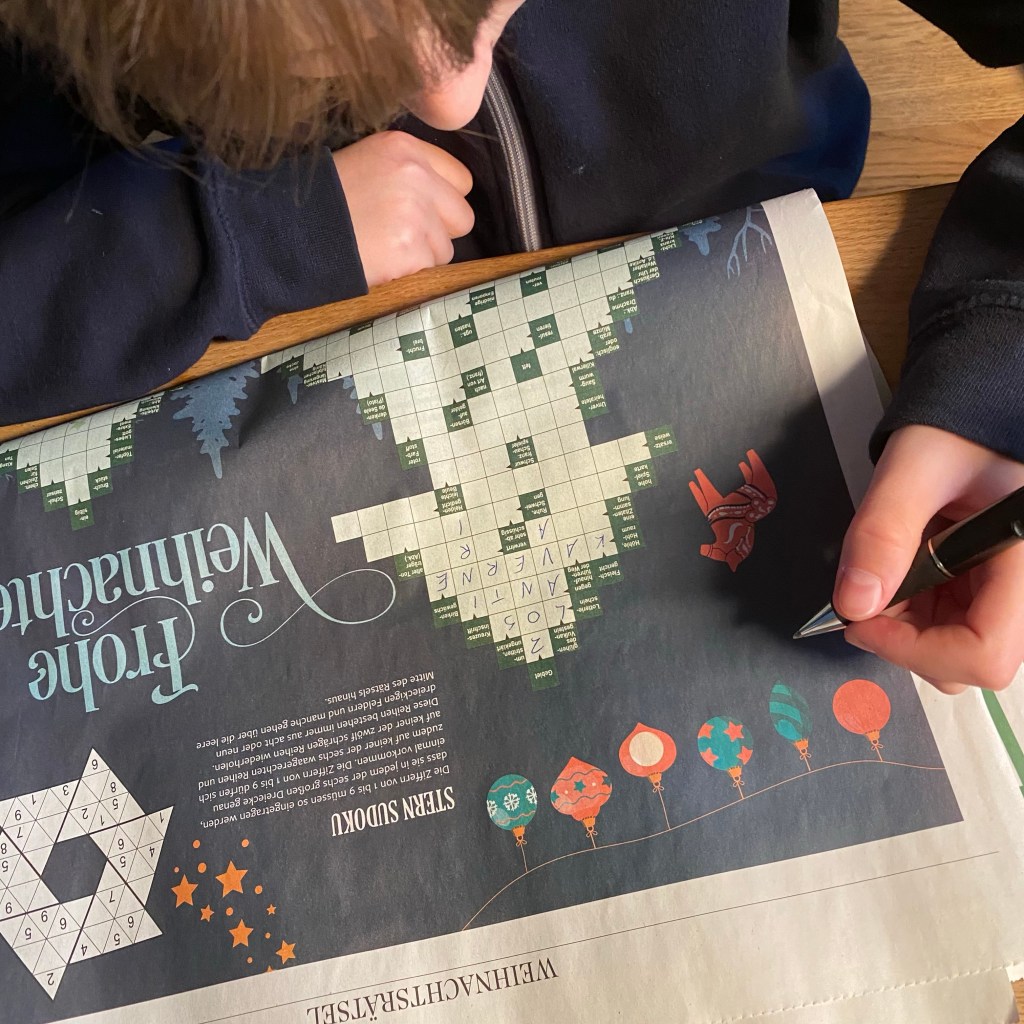 [kneteeis:] „Wow, super. Bei mir ist ein Spruch zum Schenken und ein Schoko-Mond. Komm‘, jetzt rätseln wir noch die letzte Aufgabe im EXIT-Kalender!“