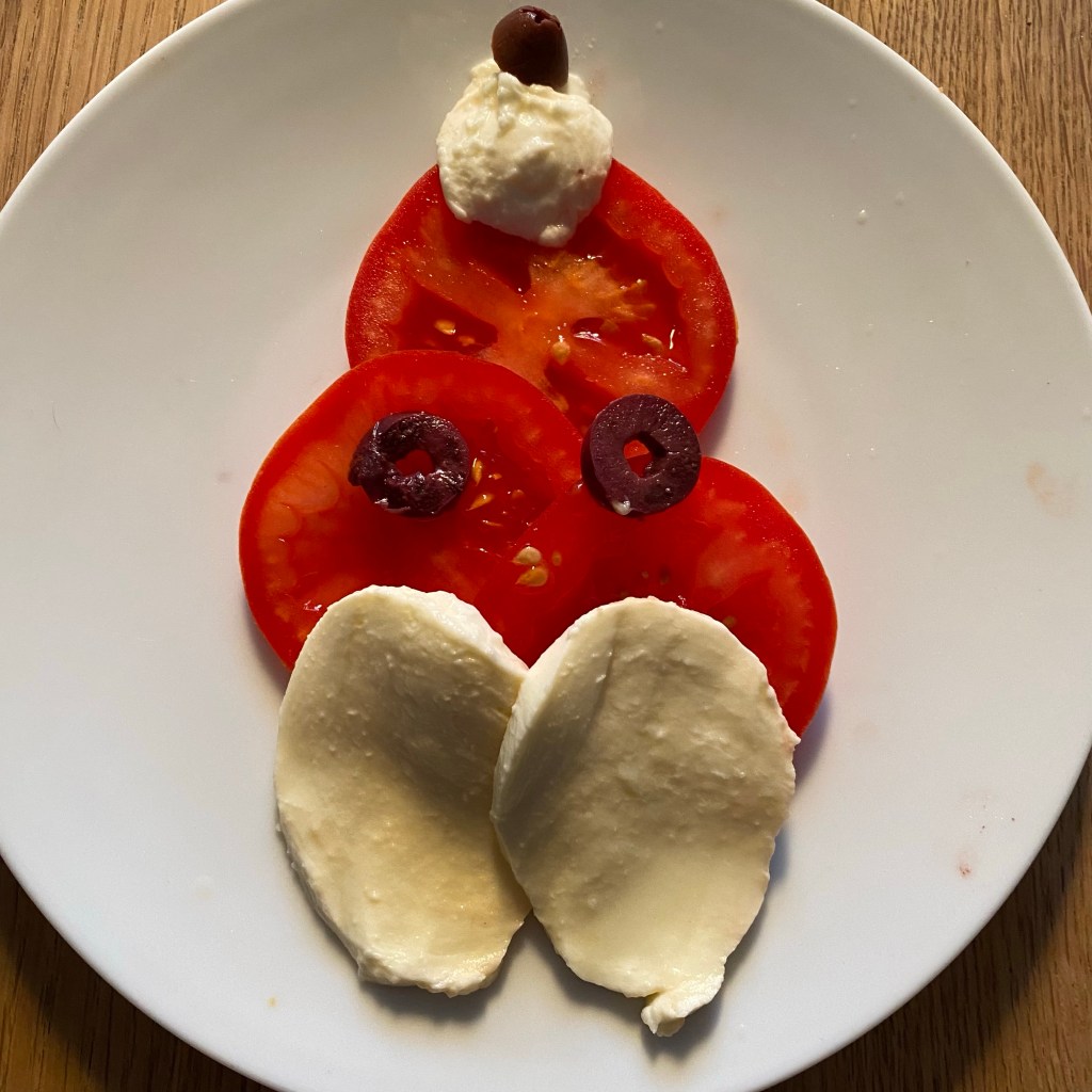 [kneteeis:| „So, das Essen ist fertig! Es gibt zur Vorspeise Tomate und Mozzarella in Weihnachtsmannform, und dann Blumenkohlsuppe mit Räucherlachs.“