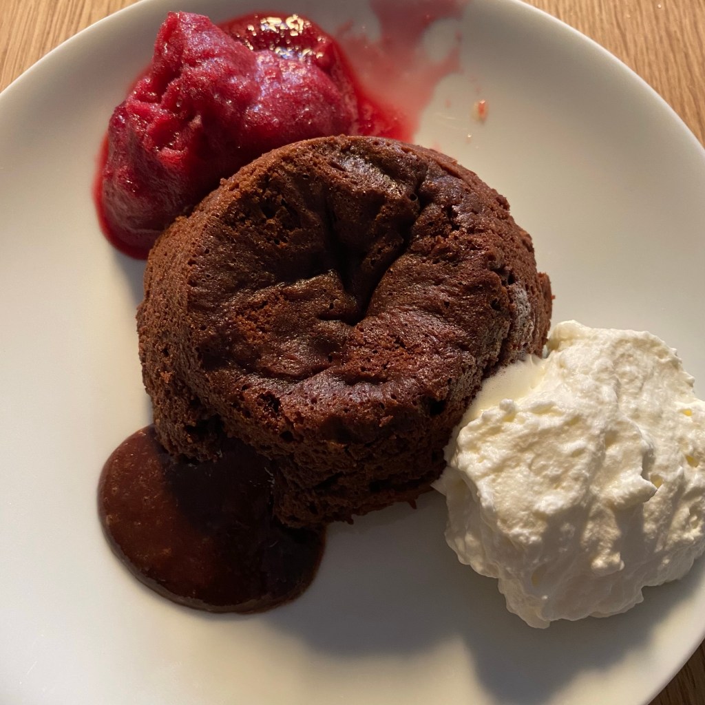 [Noch später. GJ:] „Und hier der Nachtisch: Lava-Cake mit selbstgemachtem Kirscheis und Sahne!“