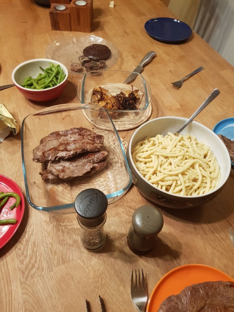 [kneteeis:] „So. Der große Junge ist mit seinem Vater bei den Großeltern, um den 85. Geburtstag vom Opa zu feiern. Da kann ich ganz in Ruhe alleine mit Buch frühstücken!“