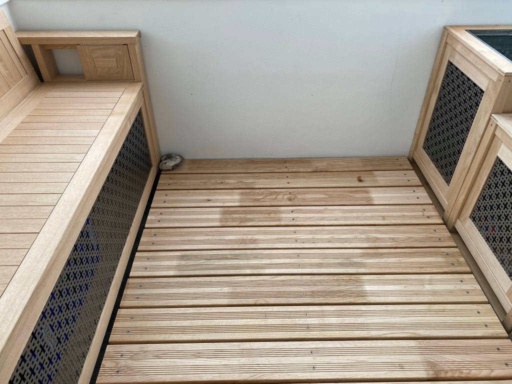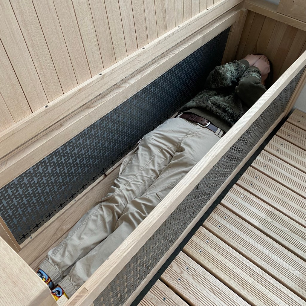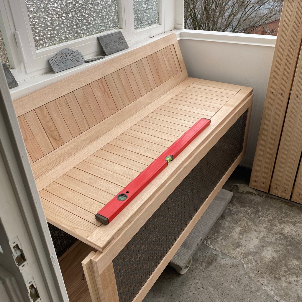[GJ:] „Nee. Die mache ich morgen um dieselbe Tageszeit wie die Vorher-Fotos. Aber ich möchte ausprobieren, ob ich in der Bank liegen kann. Und dann möchte ich die Gartensachen in die Schränke räumen!“