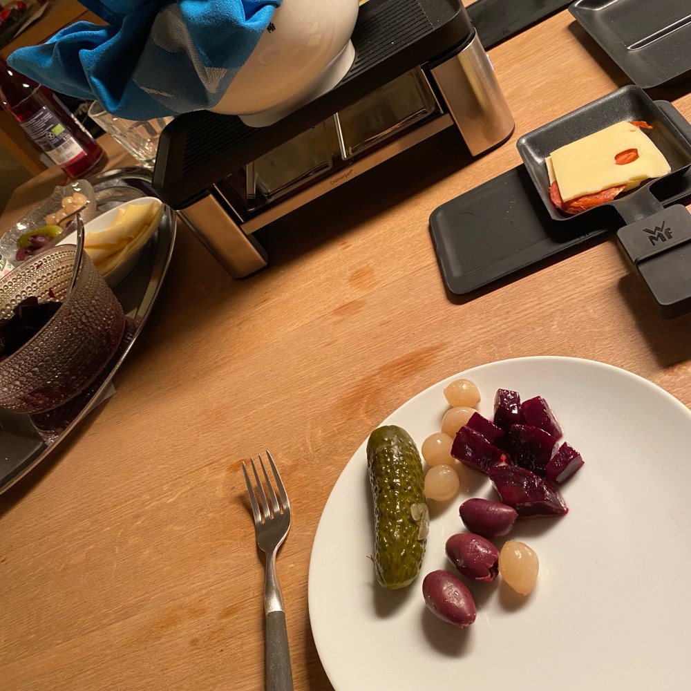 [GJ:] „Mami? Beim Aufräumen auf dem Balkon haben wir doch dieses Glas mit Oliven gefunden, das im Dezember abgelaufen ist. Was hältst Du davon, wenn wir das zum Abendessen nehmen und Raclette machen?“