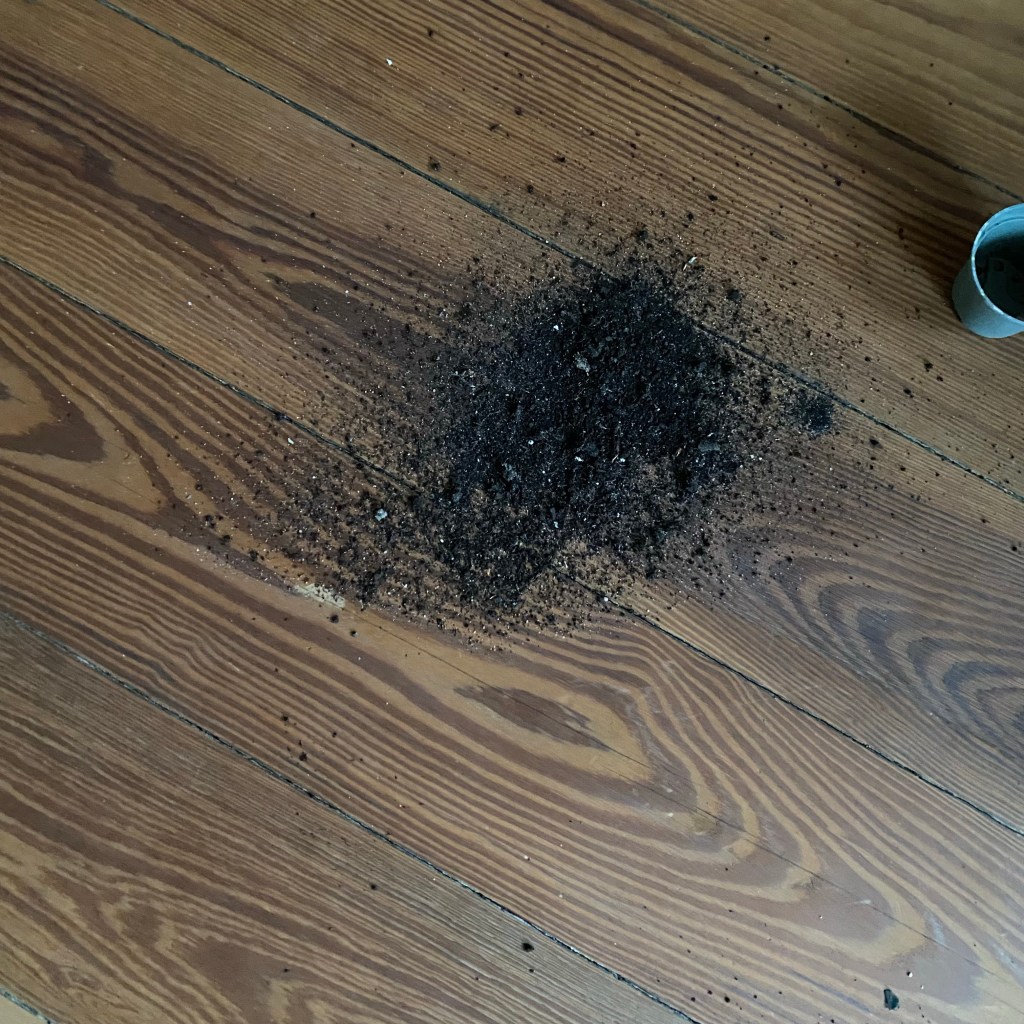 [GJ:] „Ich habe einen Blumentopf mit Erde angehoben, und weil der unten diese Lücher hat, ist jetzt ganz viel Erde auf dem Fußboden. Aber das war nicht mit Absicht!“