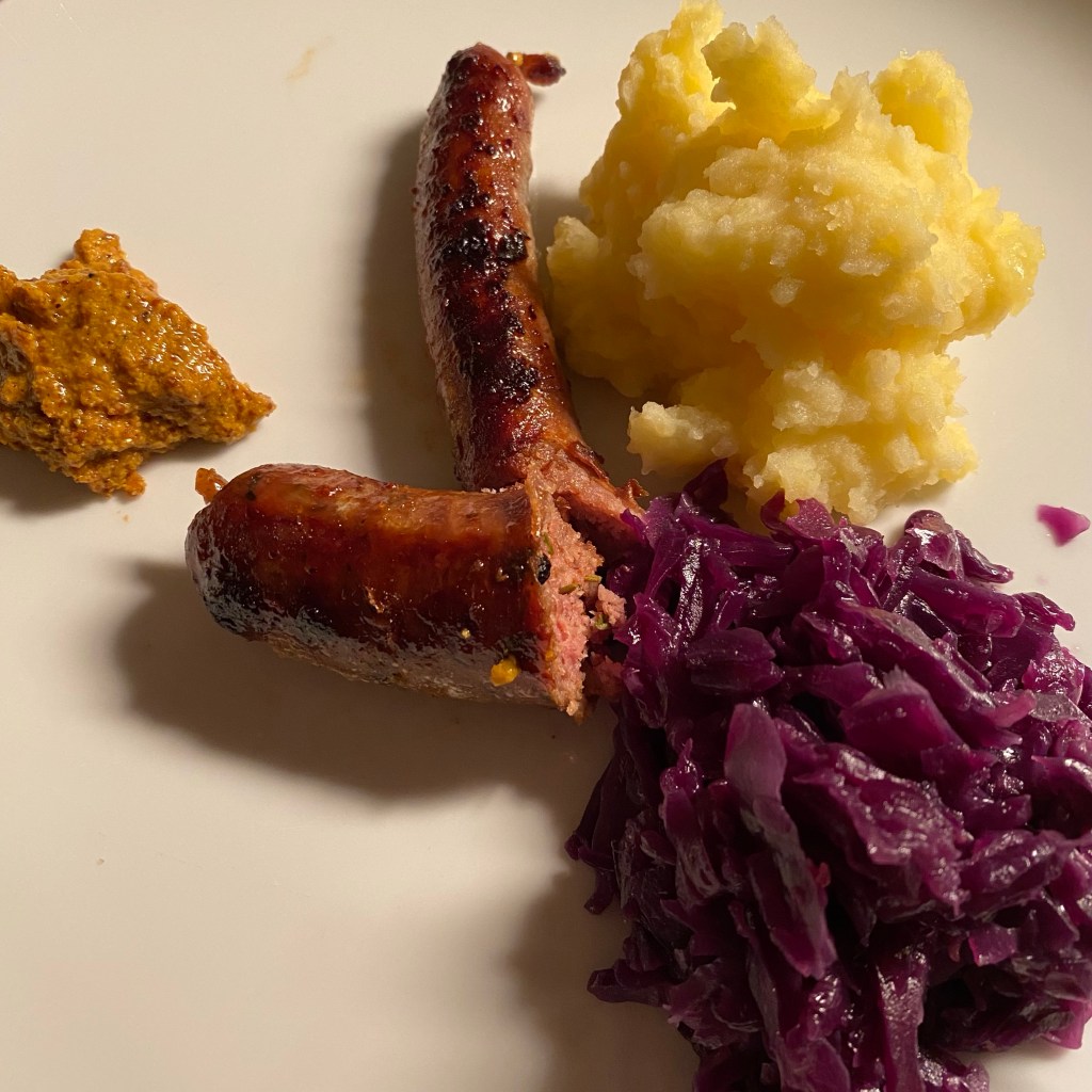 [kneteeis:] „Okay. Und danach gibt es Bratwürstchen mit Rotkohl und Kartoffelpüree.“