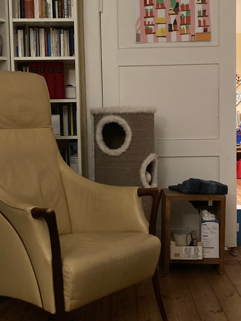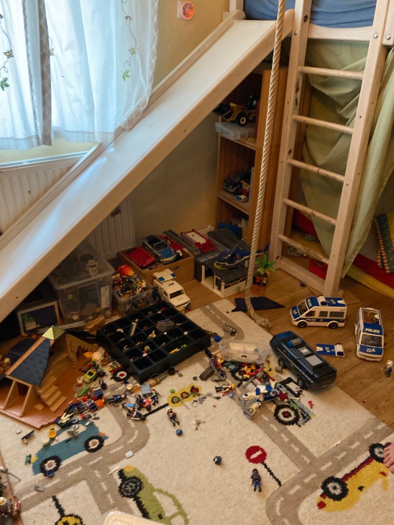 [folienstern:] „Die Kisten für Dein Zimmer sind angekommen! Dann können wir jetzt das Playmo so aufräumen, dass Dein Zimmer katzensicher ist, bevor die am Dienstag gucken kommen, ob alles passt.“