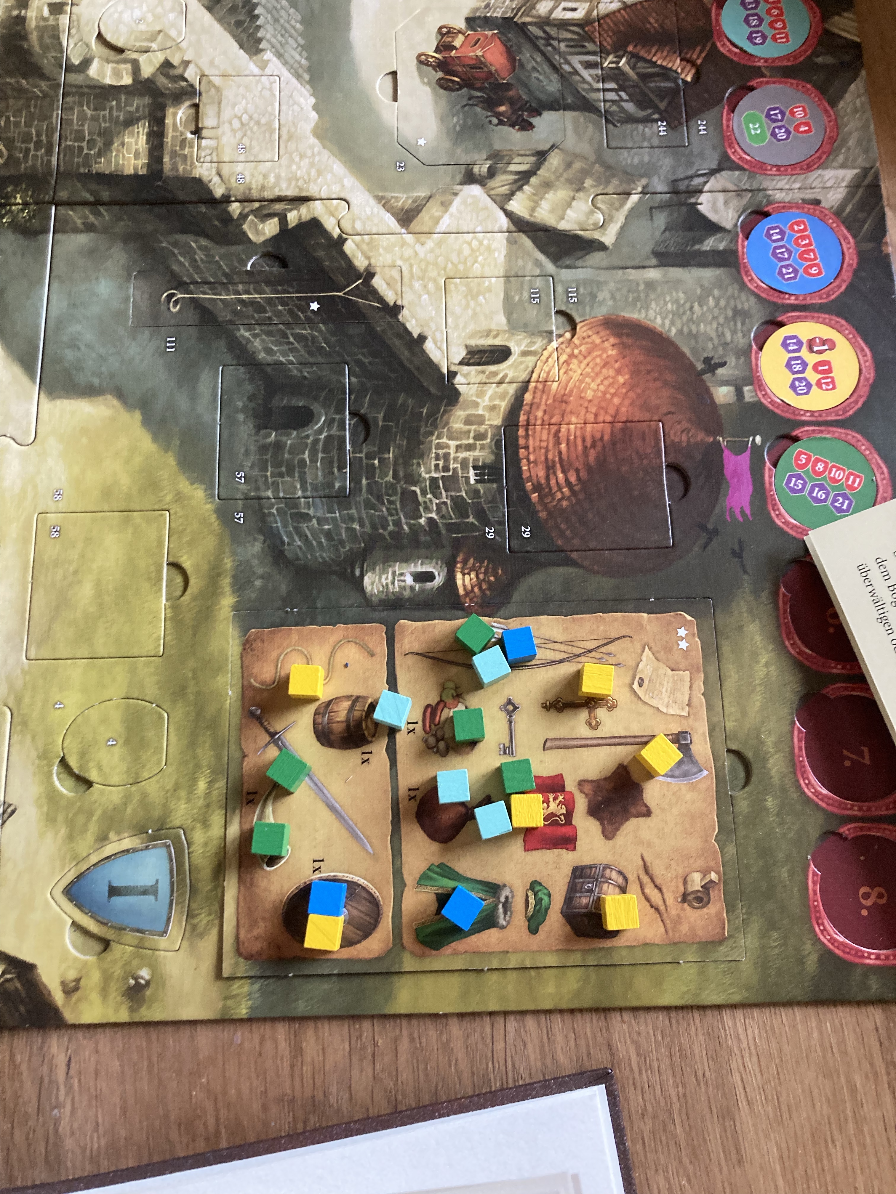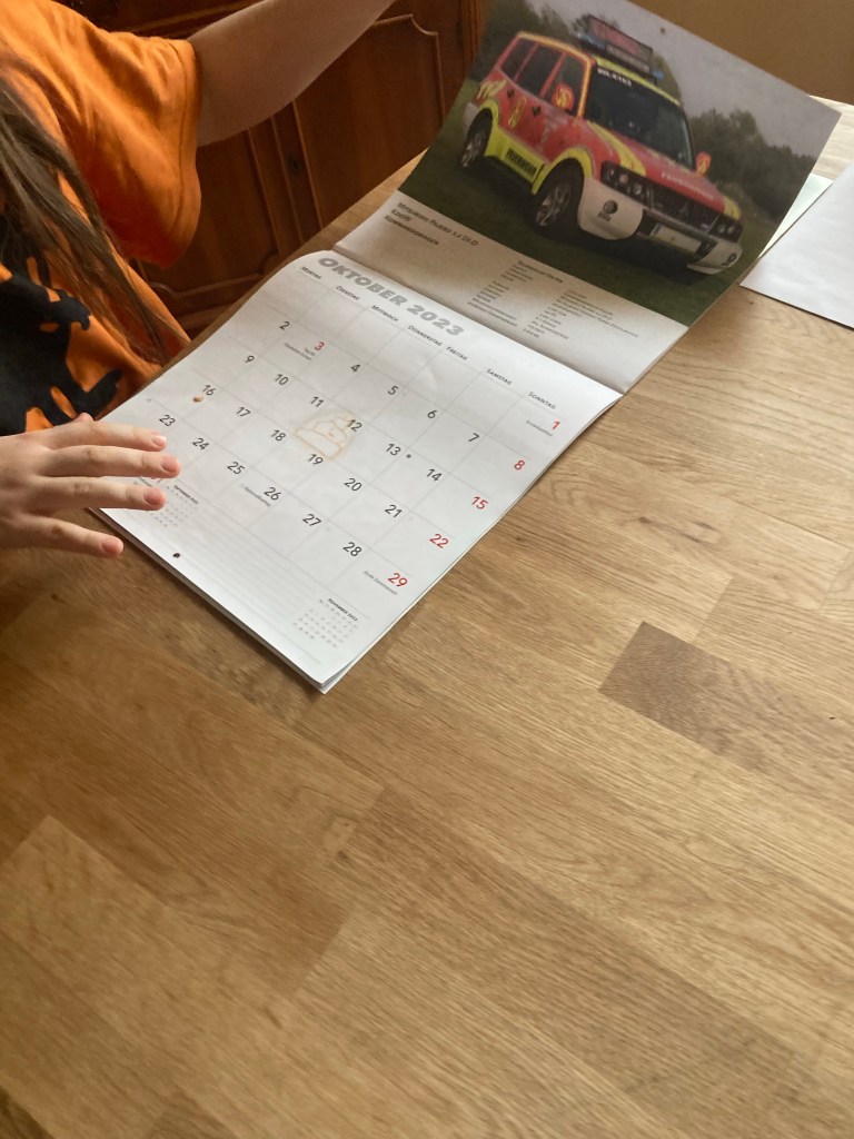 [KM:] „Mama! Du hast den Kalender noch gar nicht aufgemacht, den mir Opi geschenkt hatte! Jetzt mache ich ihn auf. Und jetzt kreuze ich alle Tage ab, die schon waren!“