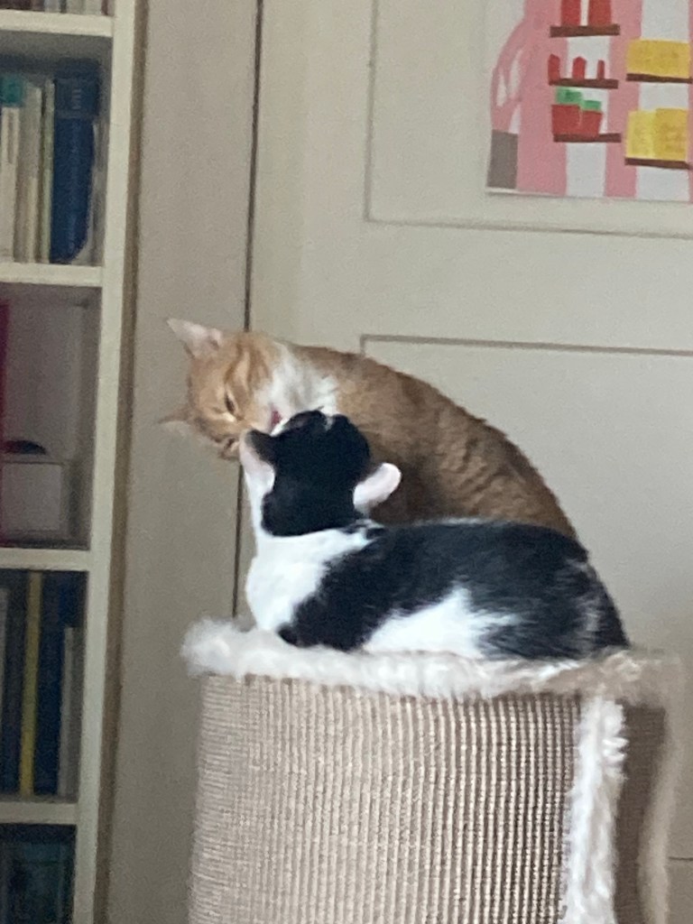 [KM:] „Guck mal! Jetzt sind beide Katzen auf der Tonne!“