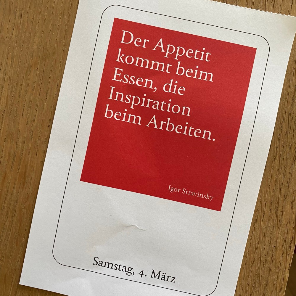 [kneteeis:] „Hier ist der Spruch von gestern: ‚Der Appettit kommt beim Essen, die Inspiration beim Arbeiten‘. Das hat Igor Stravinsky gesagt.“