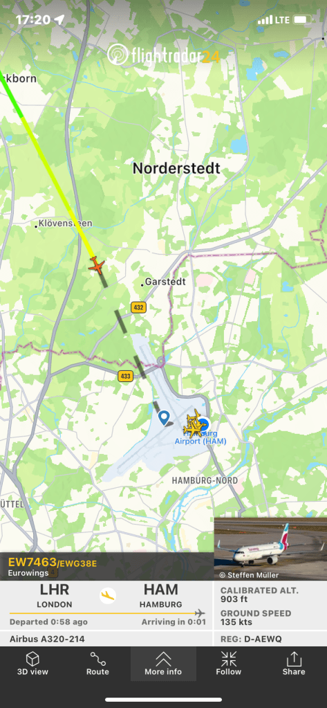 [kneteeis:] „Na prima, alles fertig für den Geburtstagstisch vom großen Jungen für nachher, und die Maschine landet gerade aus Hamburg in London Heathrow.“