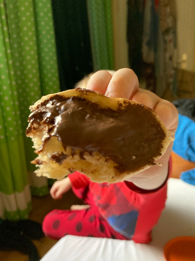 [KJ:] „Guck mal, Mama, ich hab ein Nutellabrötchen!“