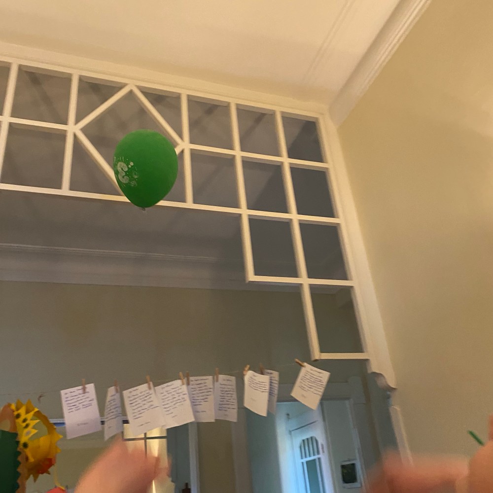 [Etwas später. GJ:] „Jetzt zeige ich Dir das Luftballonspiel, das ich erfunden habe: Man muss den Luftballon da oben durch die Raute kriegen!“