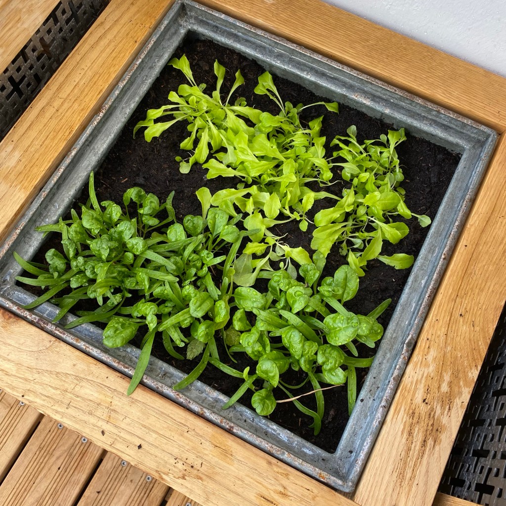 [GJ:] „Oh, guck‘ mal: Unser Salat und unser Spinat sind auch bald erntefertig!“
