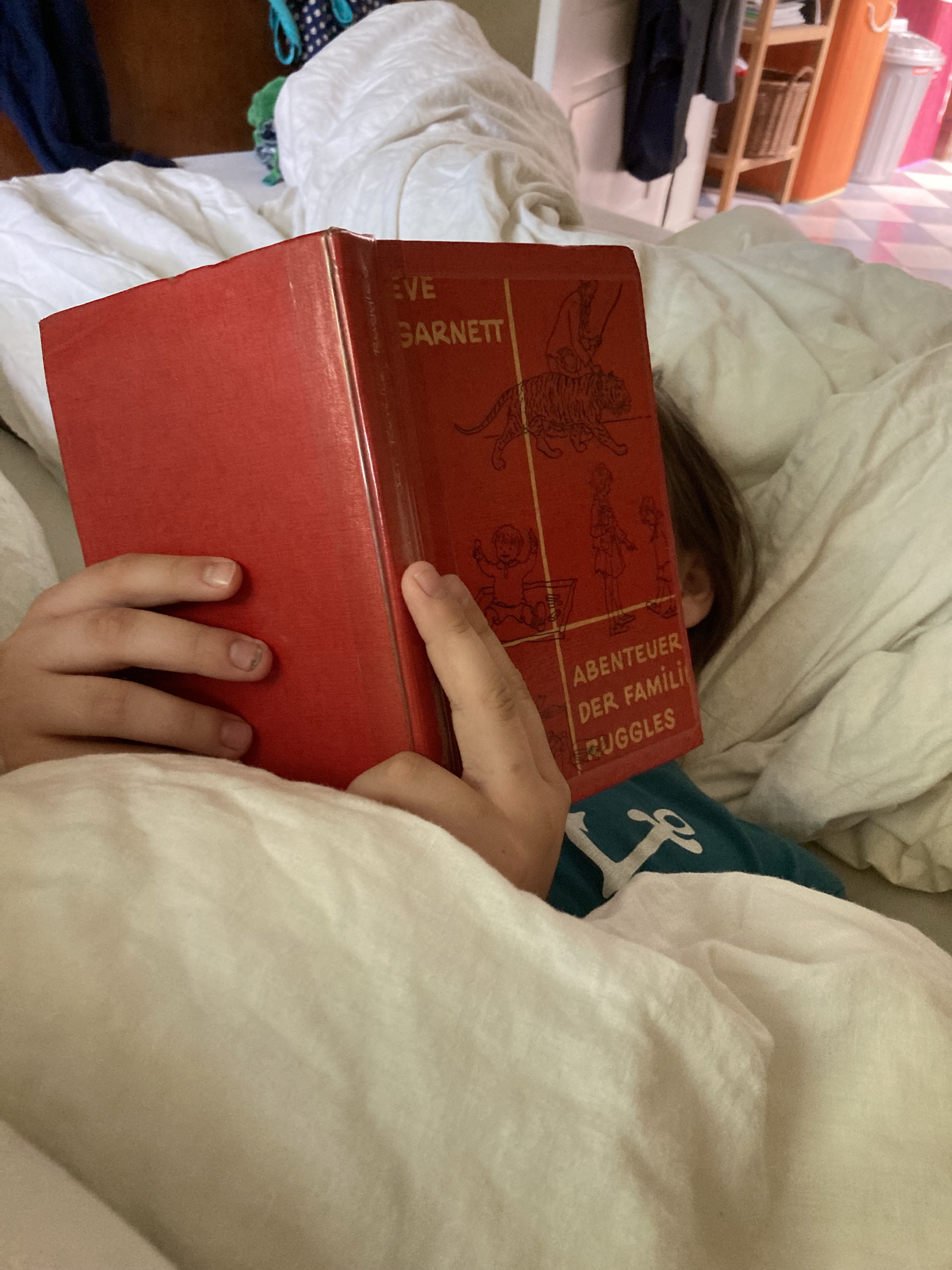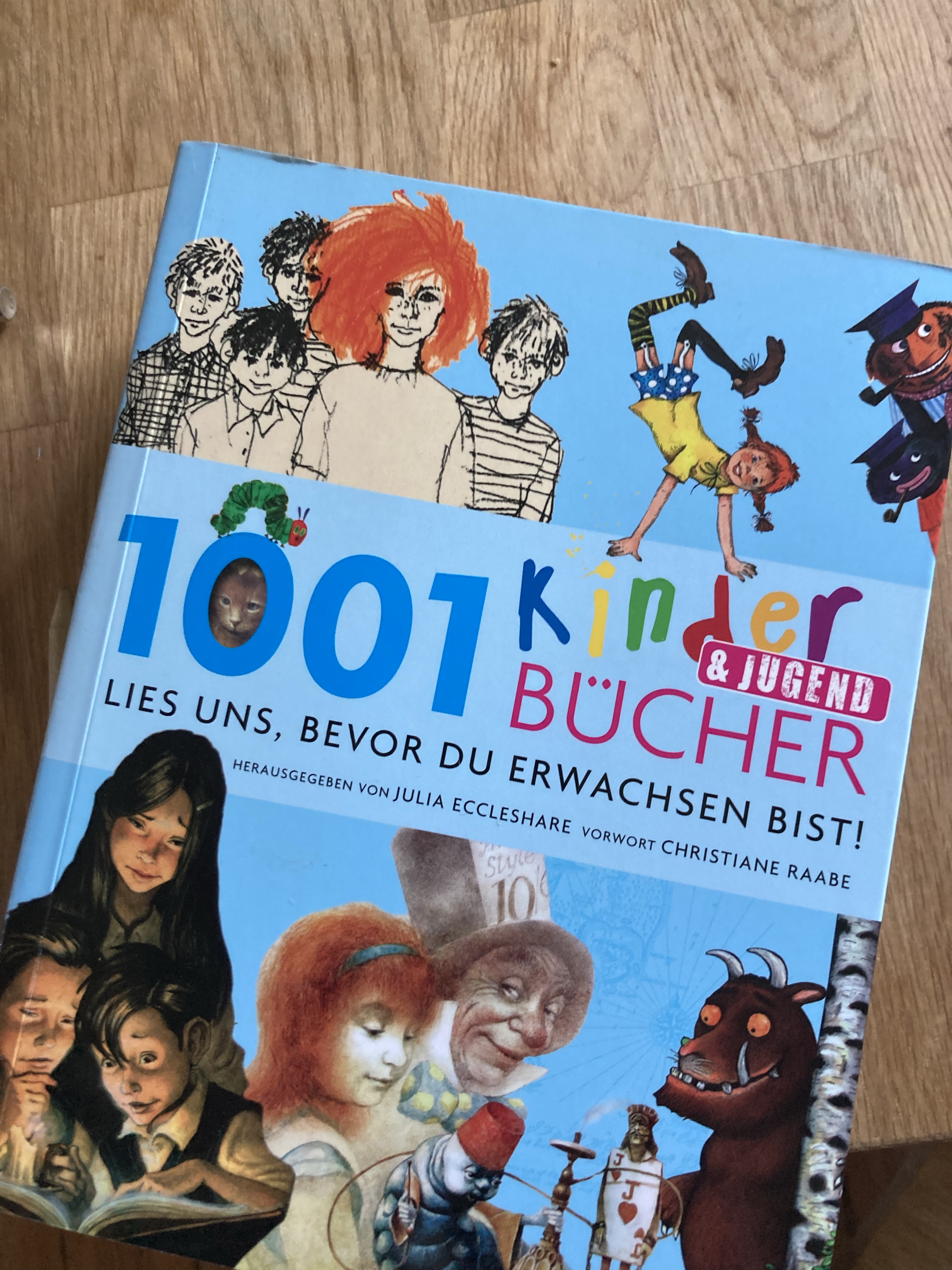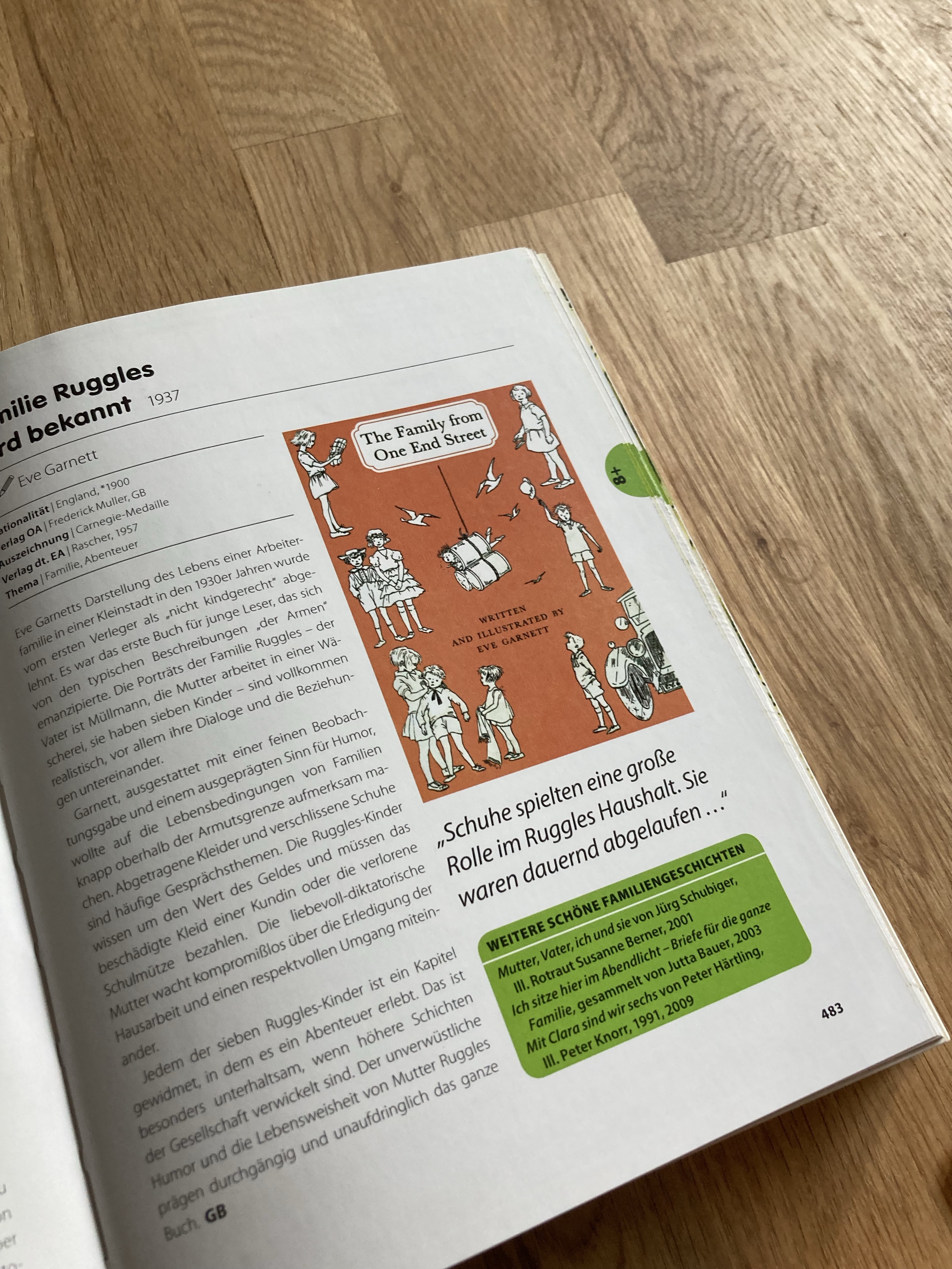 [folienstern:] „Wollt Ihr mal reingucken, ob Ihr was da was Gutes zu lesen findet bei den 1001 Büchern, die da gesammelt sind? Oh, guck mal – Familie Ruggles!“