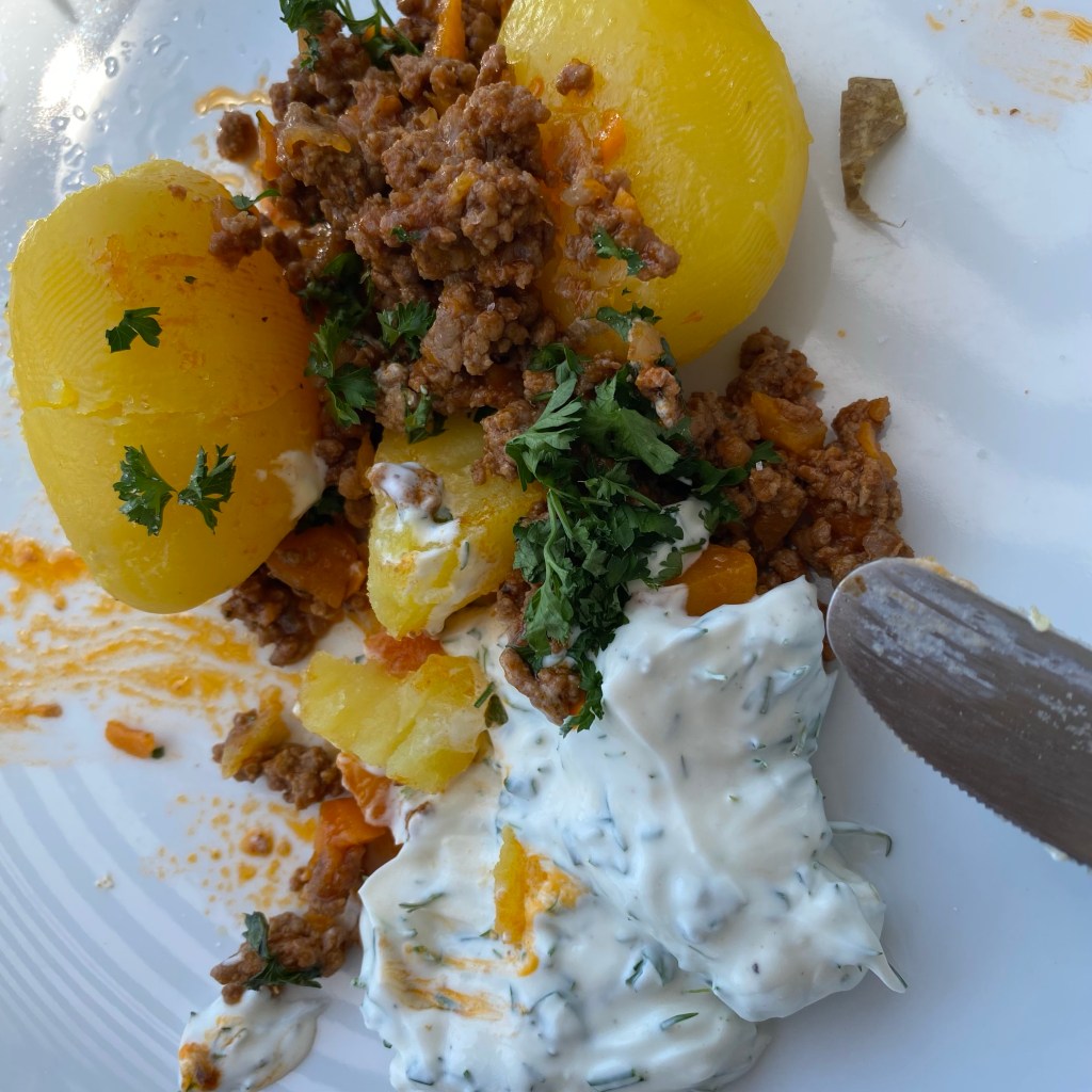 [kneteeis:] „Ich habe ein Rezept aus der Zeitung gemacht. Kartoffeln mit Hackstippe und Kräuterquark.“