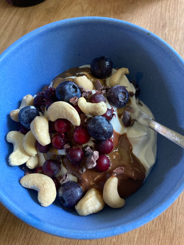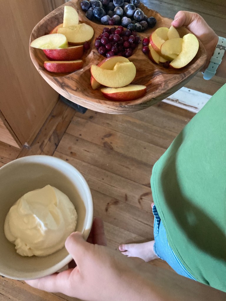 [KM:] „Machen wir jetzt ein gesundes Frühstück mit dem schönen Brett vom Weihnachtsmarkt?? So mit ganz viel Obst?“