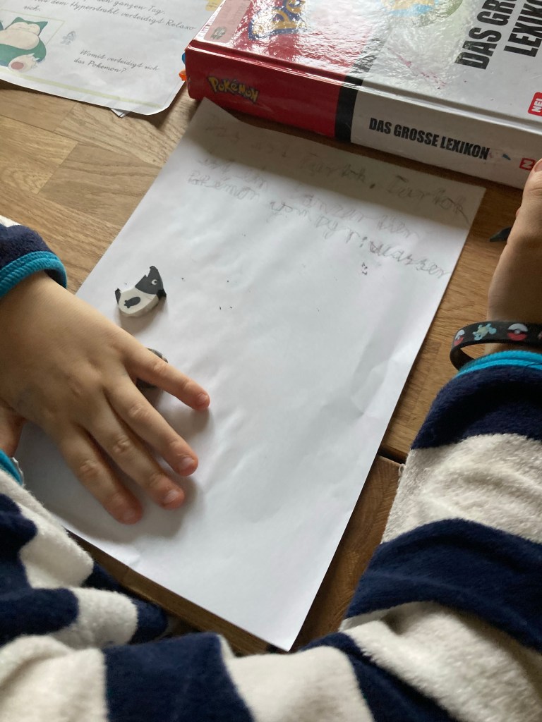 [KJ:] „Jetzt mache ich noch Aufgaben aus dem Matheblock. Und dann schreibe ich an dem Buch für´ das Pokemonreferat.“