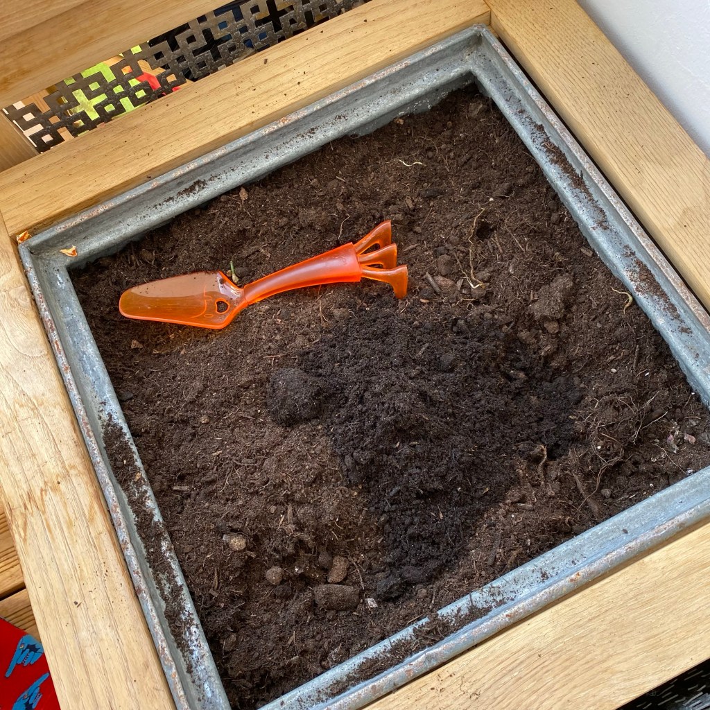 [GJ:] „So, jetzt bepflanzen wir das Beet neu, wo der Salat war. Wir nehmen wieder Salat, und dann noch Rote Bete, okay?“