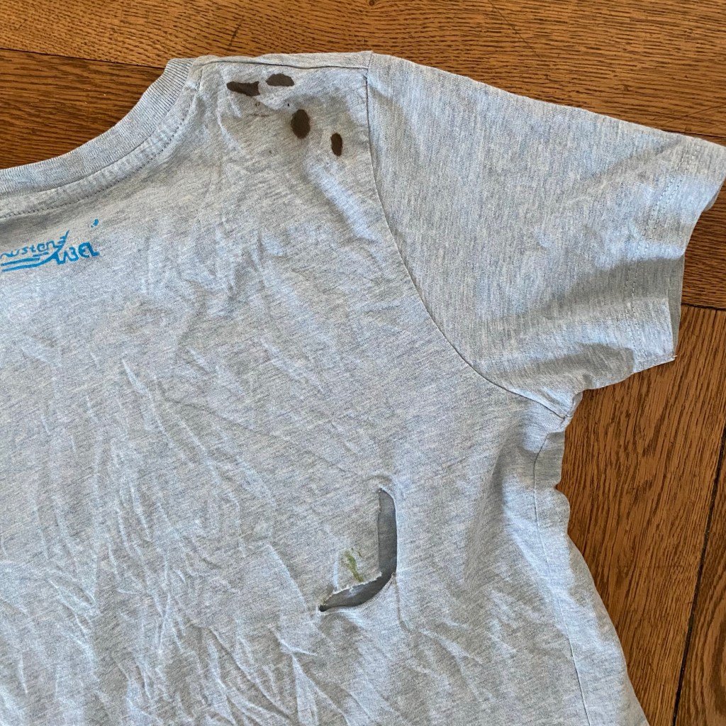 [kneteeis:] „Ach Du liebes Bisschen: Das T-Shirt vom großen Jungen sieht ja aus, als habe er mit einem Drachen gekämpft! Wie gut, dass die Schrammen nicht so schlimm waren…“