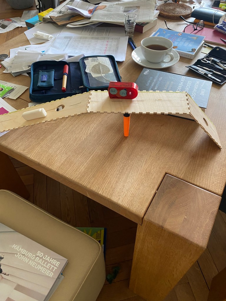 [GJ:] „Guck‘ mal, ich habe aus dem alten Schuber aus der Schule eine Straße gebaut! Man kann daraus sogar eine Brücke machen, und das Radiergummi und der Anspitzer können darauf fahren!“
