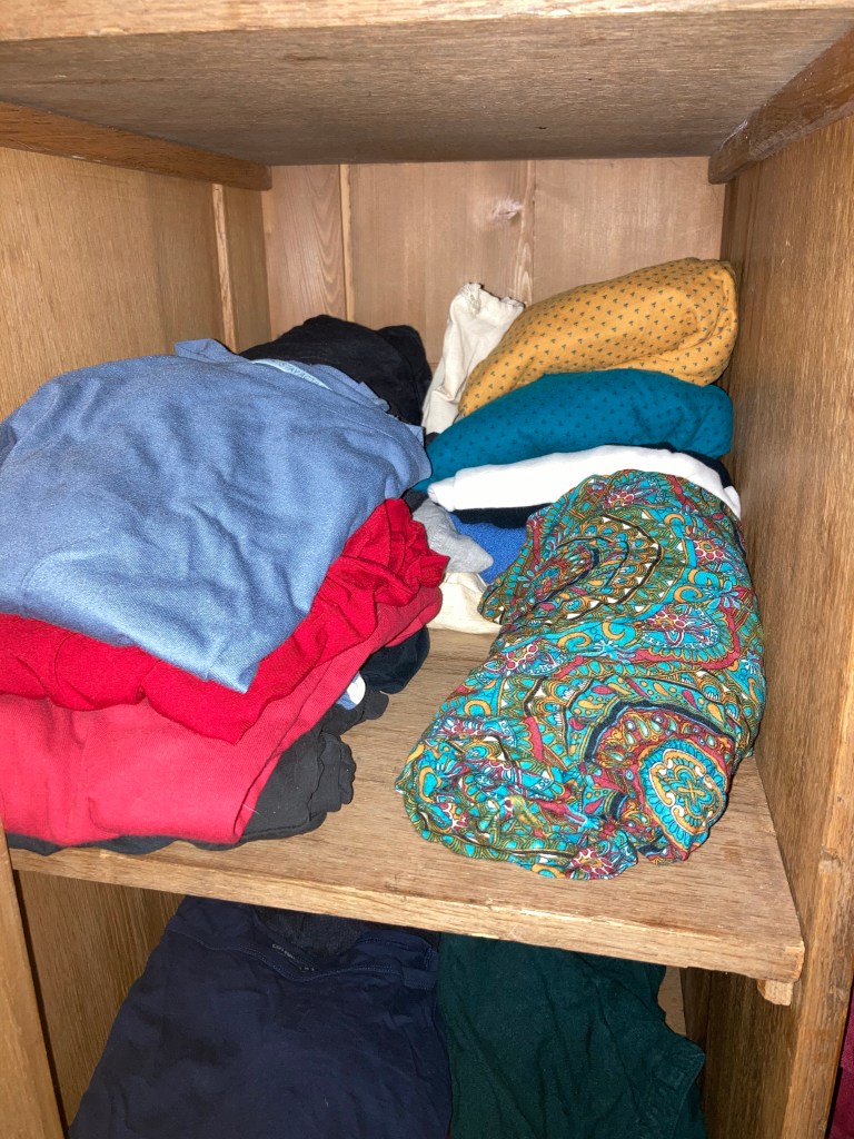 [Etwas später. folienstern:] „Alles klar – außer den kaputten Sachen kannst Du die aussortierten alle gerne haben! Und meine blaue Hose habe ich auch gefunden!“