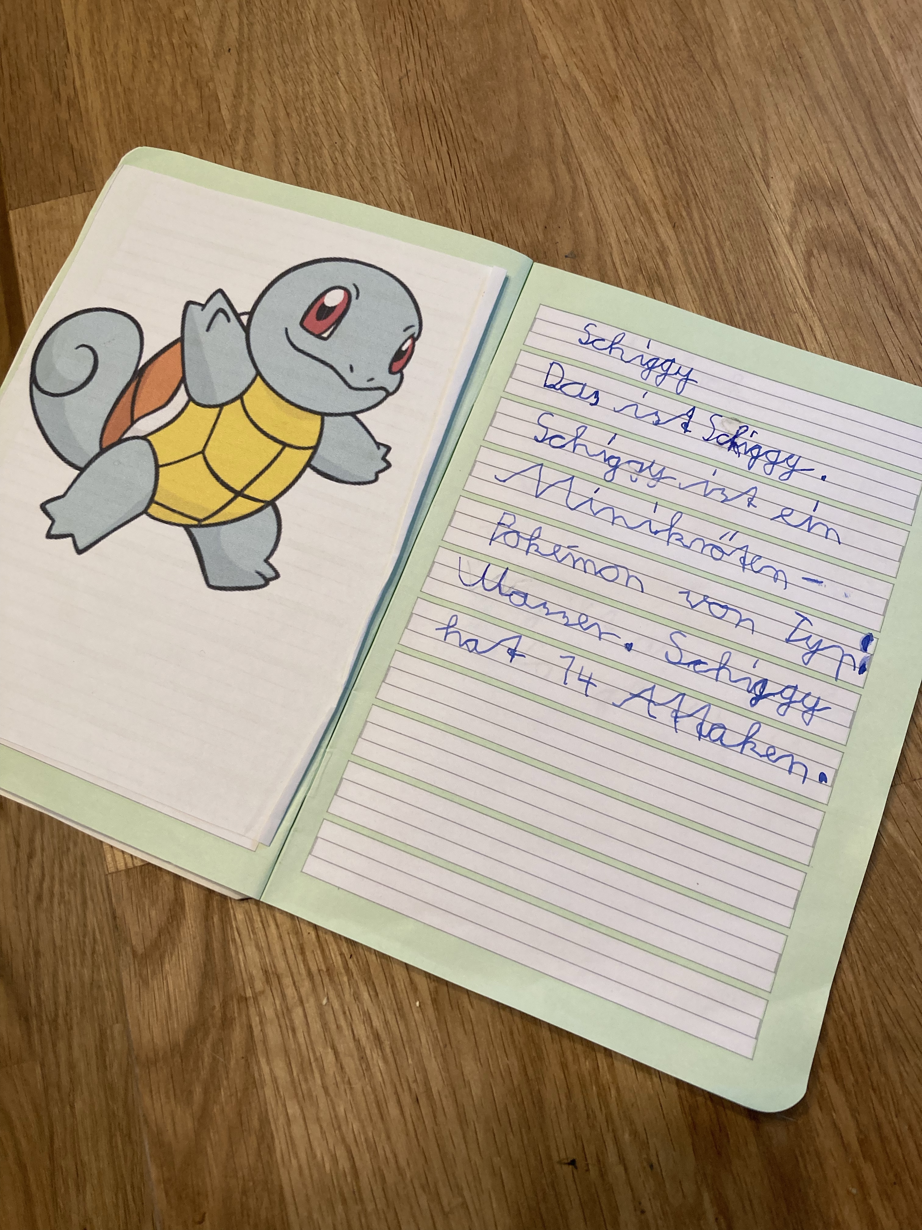 [folienstern:] „Ich tue Dein Pokémon-Buch in Deinen Ordner. Was fandest Du denn gestern an Deinem Referat das Beste?“