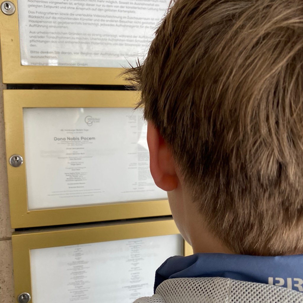 [kneteeis.] „So, jetzt los zu ‚Dona Nobis Pacem‘. Das letzte Mal in dieser Spielzeit. Heute kommt unsere frühere Kinderfrau mit. Ich freue mich schon!“