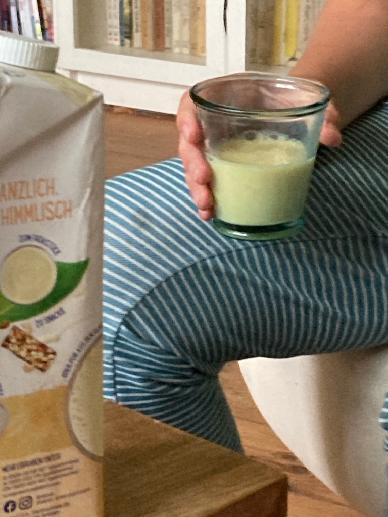 [folienstern:] „Da ist Vanillemilch, mit Soja.“