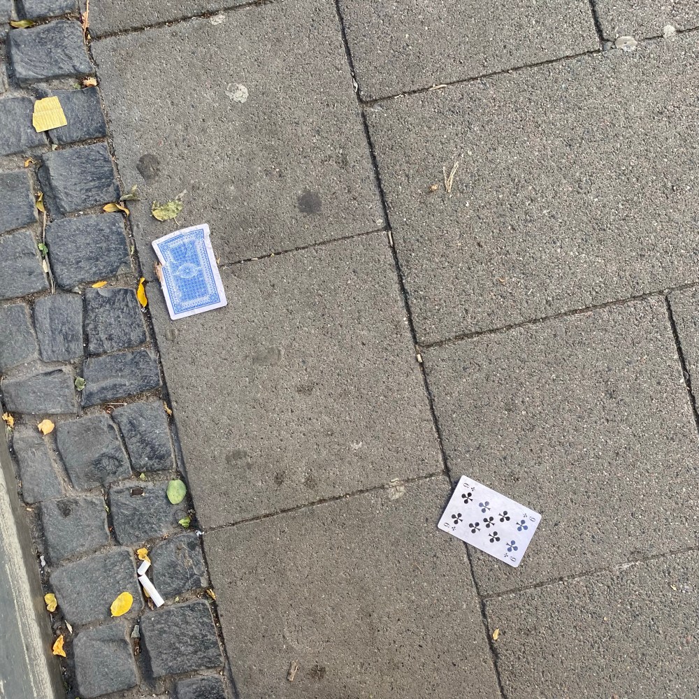 [Etwas später. BB:] „Oh, da ist eine Kreuz Neun! Die nehme ich mit – oder nein: Da sind noch mehr Karten. Vielleicht will jemand noch das ganze Kartenspiel zusammensuchen!“