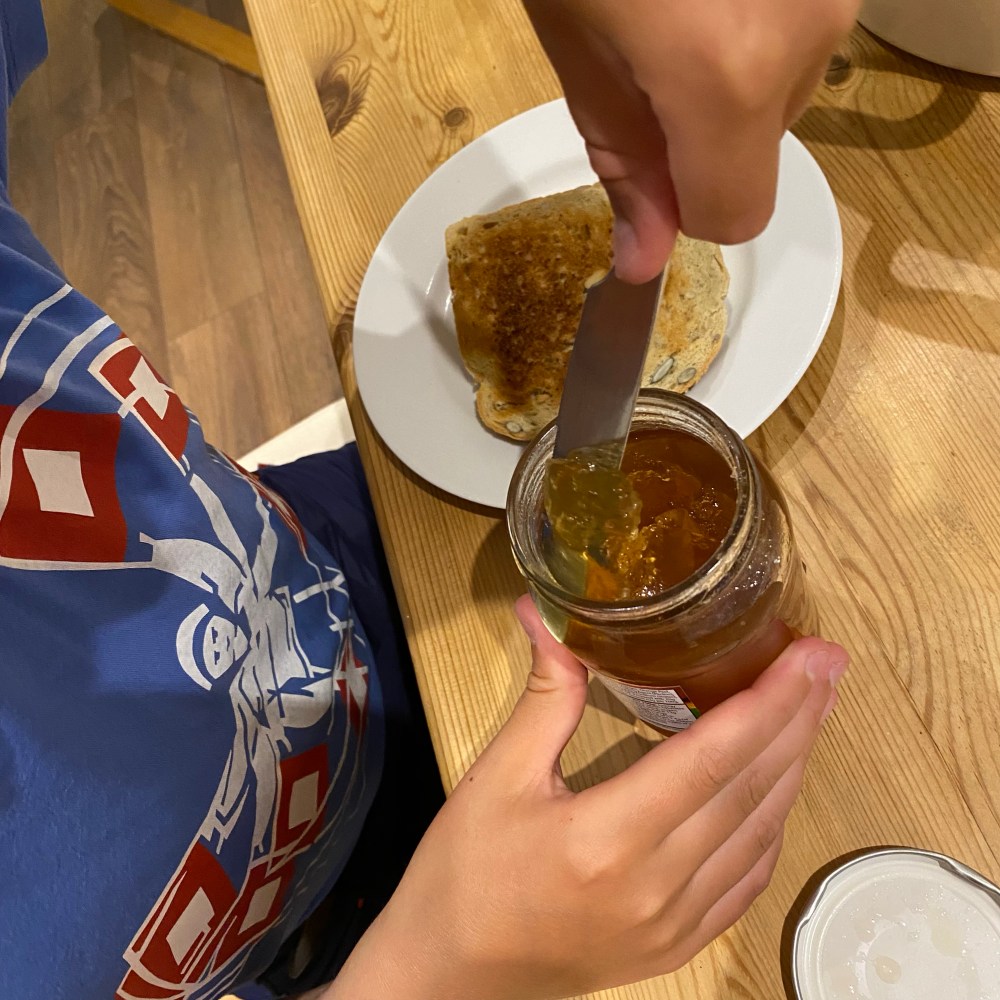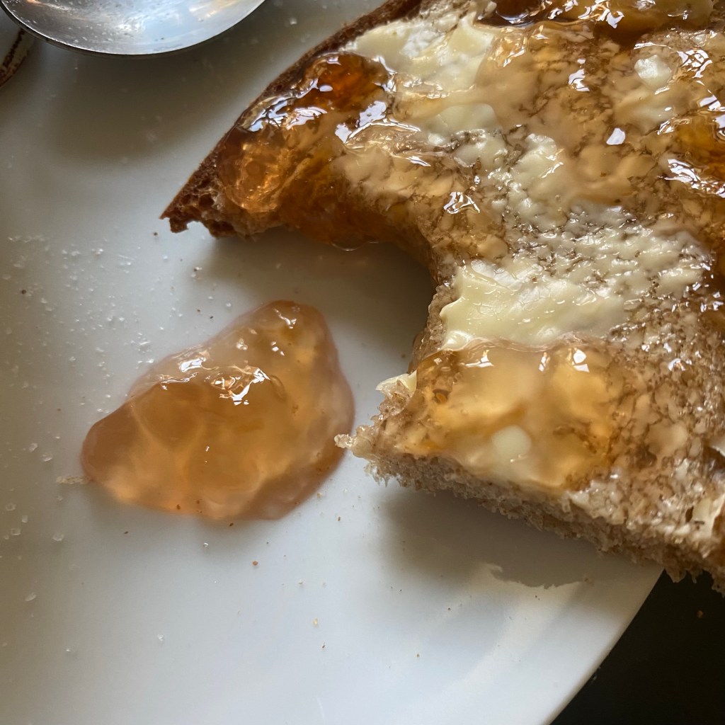 [Kurz darauf. kneteeis:] „Warte, ich mache ein Foto. Und gleich noch eins davon, wie mir die Marmelade vom Brot gerutscht ist.“