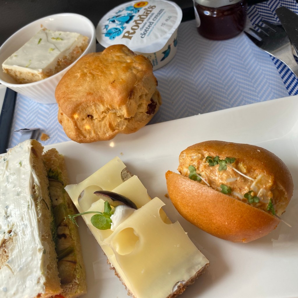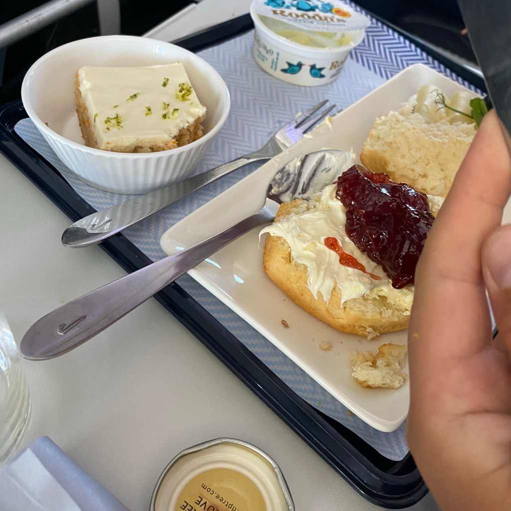 [Flugbegleiter:] „Today, we have afternoon tea. We have some finger sandwiches, some cake, and scones. Would you like meat or vegeterian?“
