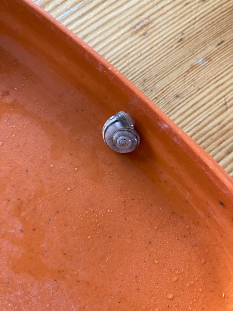 [KM:] „Oh, Mama, da müssen wir die Schnecke noch rausnehmen, die wir in der Bahn in den Trauben entdeckt haben!“