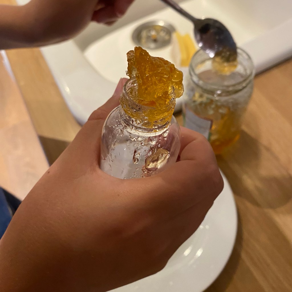 [BB:] „Weißt Du was? Wir nehmen einfach die leere Flassche von meinem Zahnputzzeug und füllen die restliche Orangenmarmelade da rein!“