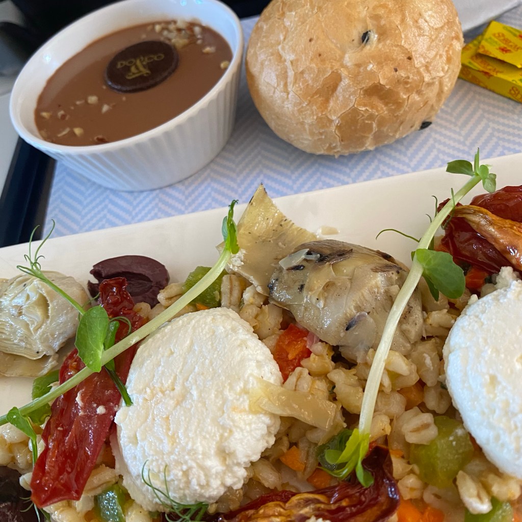 [Flugbegleiter:] „We have Sandwiches, either with Beef and Salmon or with a vegetable salad…“