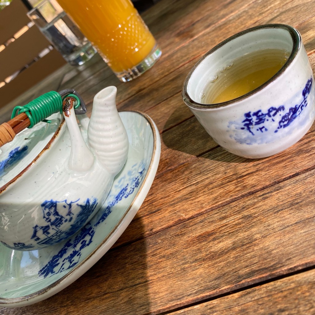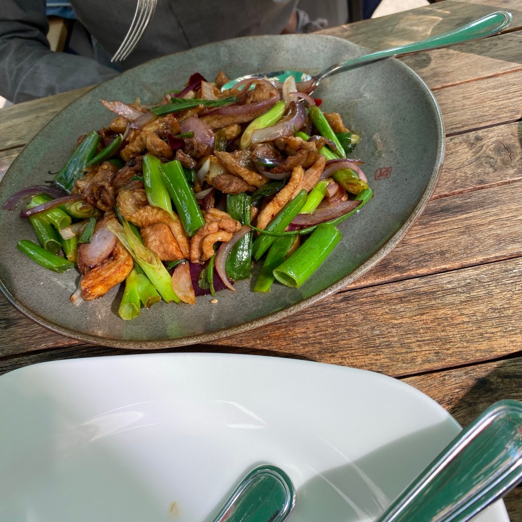 [Etwas später. BB:] „Müssen wir draußen sitzen? Und wieso liegt hier so viel Müll auf der Erde? Taschentücher und Kippen und so? Und der Lauch schmeckt mir nicht – aber die Ente ist gut…“