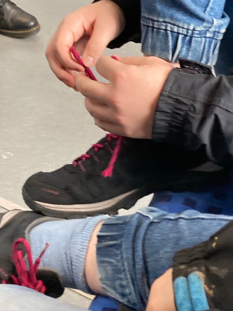 [Im Zug. folienstern:] “Weißt Du was, kleiner Junge, wir können noch ein Projekt machen über die Herbstferien. Schleife binden!”