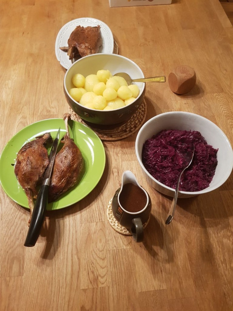 [Vater:] „Die Martinsgans ist fertig! So mit Grillen nach dem Braten geht das echt gut!“