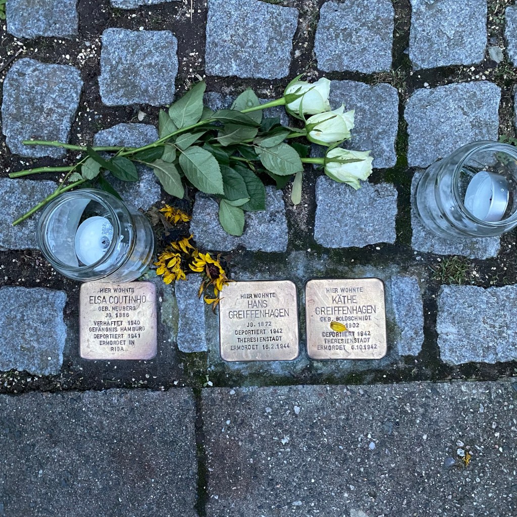 [kneteeis:] „Ah, wie schön – an den Stolpersteinen liegen immer noch Blumen, und die Kerzen zündet auch immer mal wieder jemand an! Und auf der Webseite kann man die ganzen Biographien wirklich ausführlich nachlesen!“
