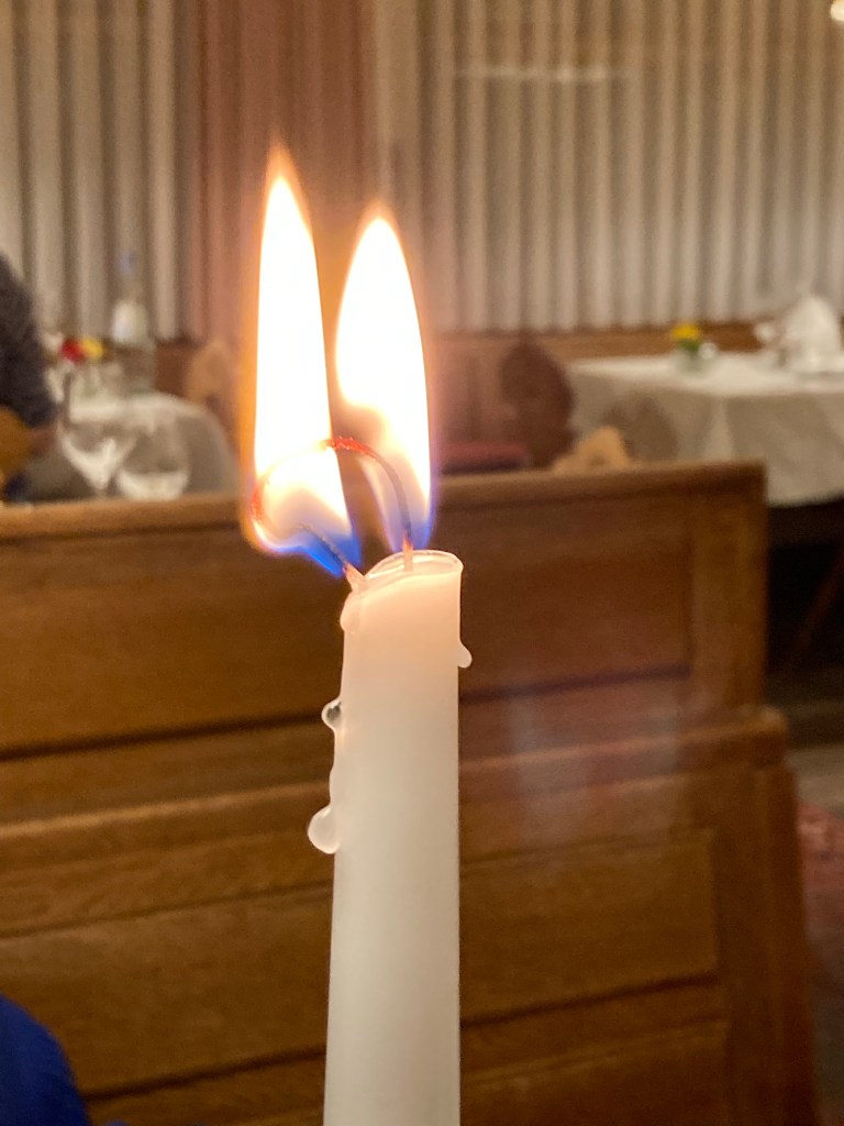 [Süddeutschland. Freitagabend. GM:] “Guck mal, die Kerze hat zwei Flammen!”