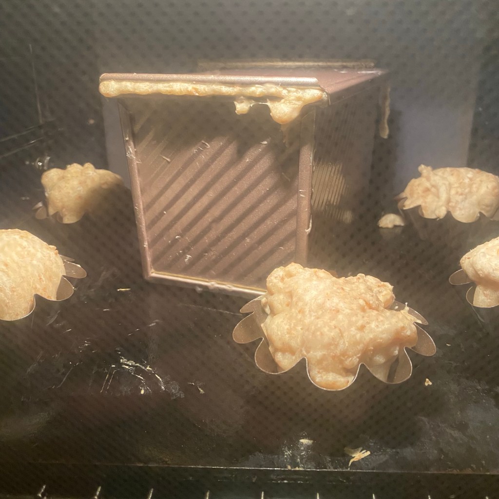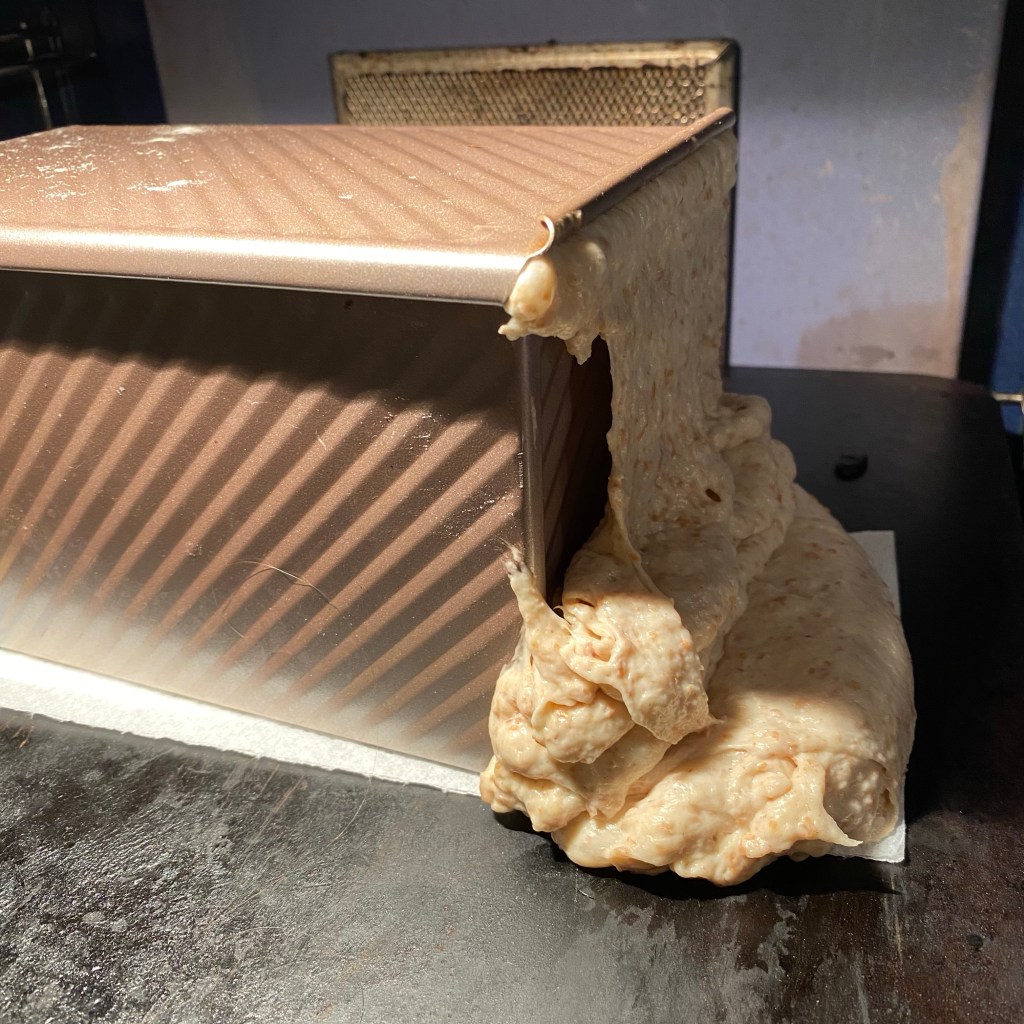 [kneteeis:] „Oh, Mist: Ich habe vergessen, dass ich das Toastbrot zum Gehen unter die Backofenlampe gestellt hatte! Jetzt ist es aus der Form gelaufen – mal gucken, wie man das retten kann…“