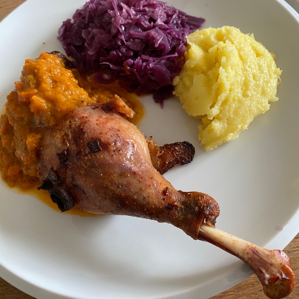 [kneteeis:] „Die Gans ist fertig! Der Rezepttipp vom Vater aus Berlin hat wirklich gut funktioniert – hervorragend saftig durch die niedrige Gartemperatur, und schön knusprig durch den Grill danach!“