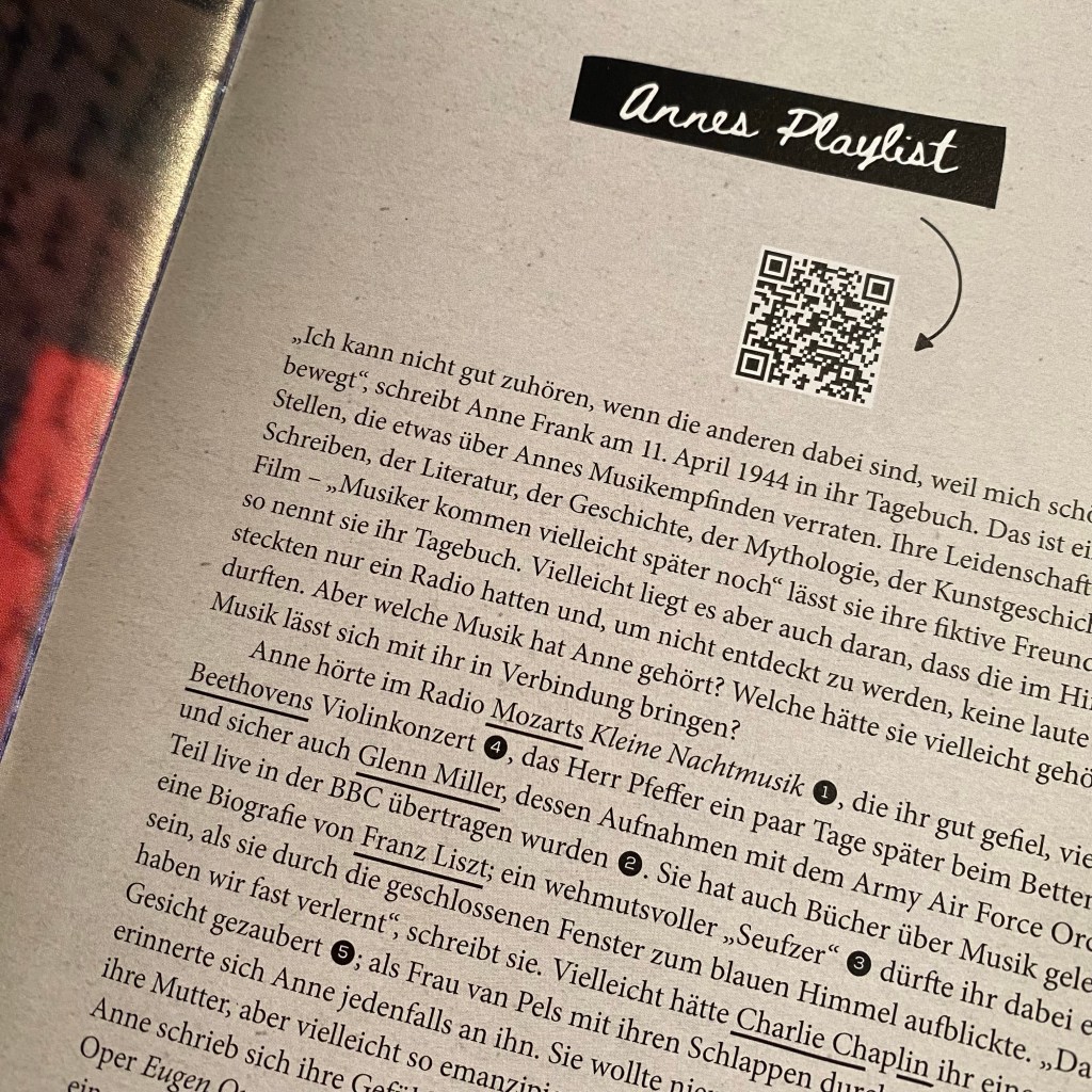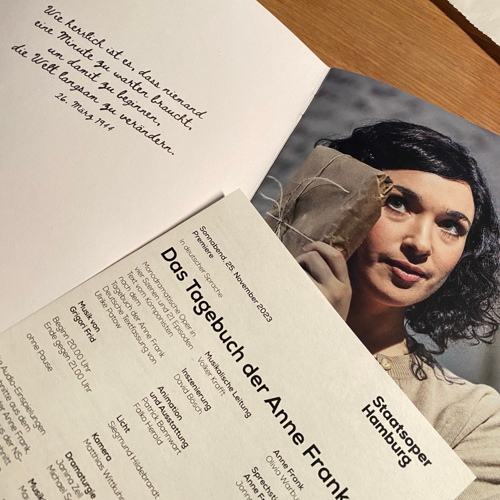 [kneteeis:] „Also, ich fand die Musik am Anfang etwas gewöhnugsbedüftig. Aber dann sehr expressiv und passend. Und dass die Texte 1:1 aus dem Tagebuch waren, fand ich auch eindrucksvoll. Im Programmheft ist übrigens auch ein Link zu einer Spotify-Playlist mit Musik, die Anne gehört hat oder hätte hören können. Das finde ich auch ziemlich originell.“