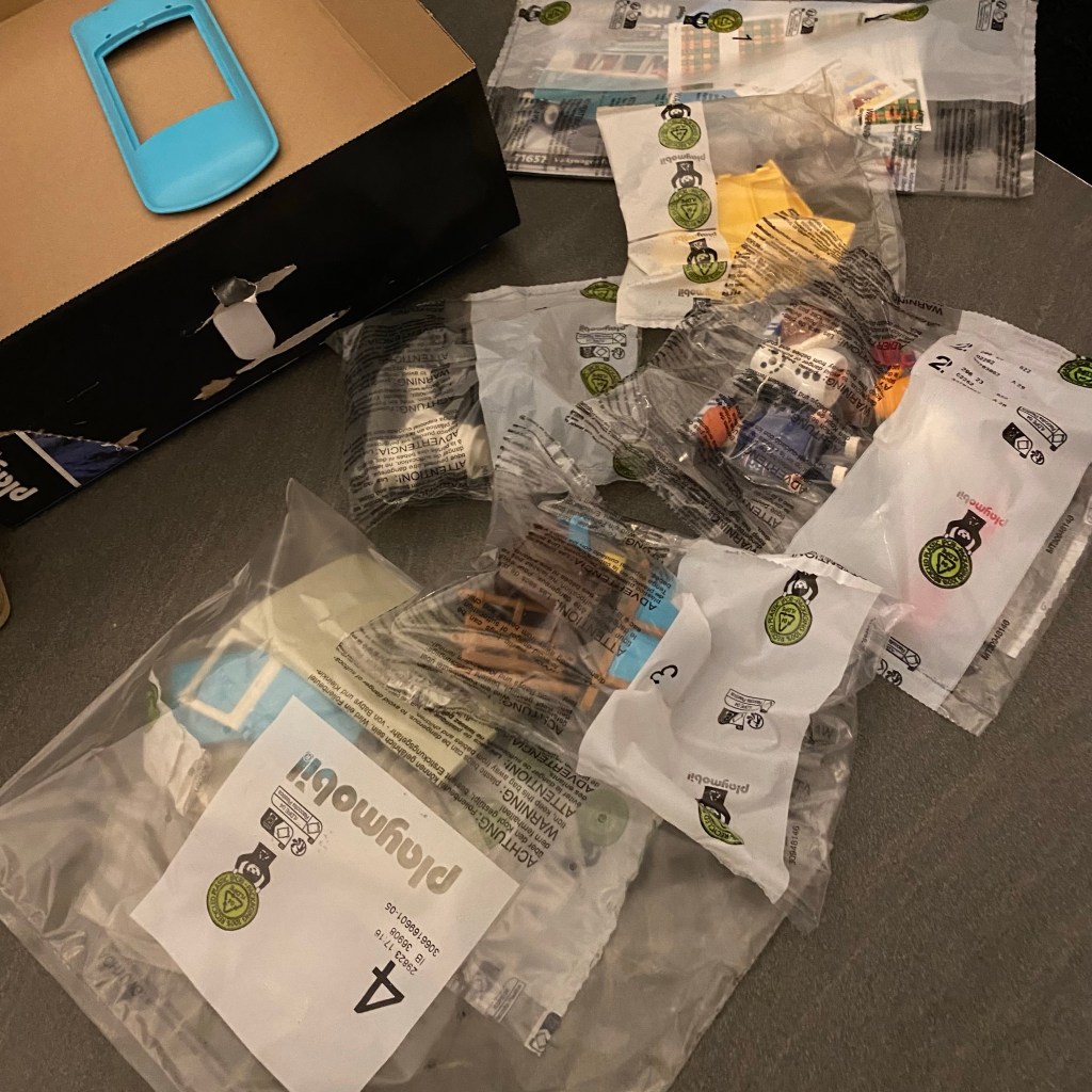 [Etwas später. GM, BB:] „Wir haben das Playmobil-Auto aufgebaut, das Du uns von Edeka mitgebracht hast!“