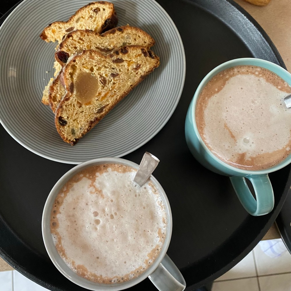 [kneteeis:] „Hier ist Kakao und Stollen für Euch. Mit Milchschaum!“