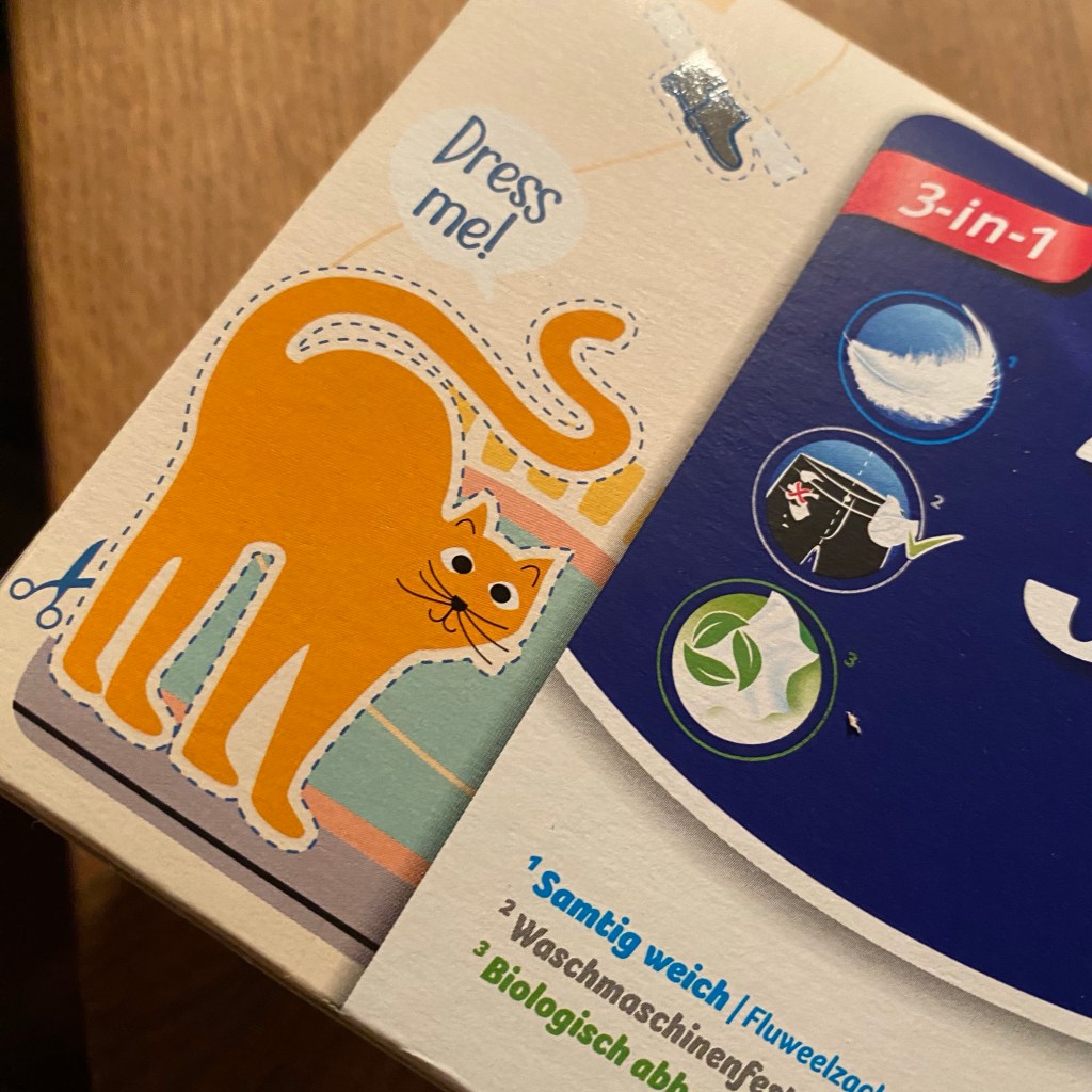 [BB:] „Naja, auf dieser sind Katzen und Ausschneideklamotten für die Katzen. Das heißt, wenn die Box leer ist, kann man Katzenanziehpuppen basteln. Wer kommt denn auf so etwas?“